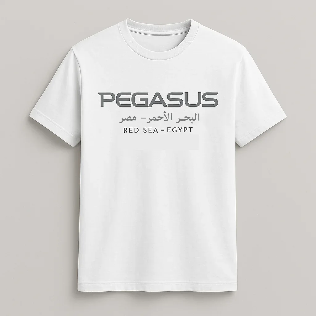 Adventure meets simplicity. Our signature Pegasus tee features the bilingual logo in sleek grey with a nod to our home base: Red Sea – Egypt.